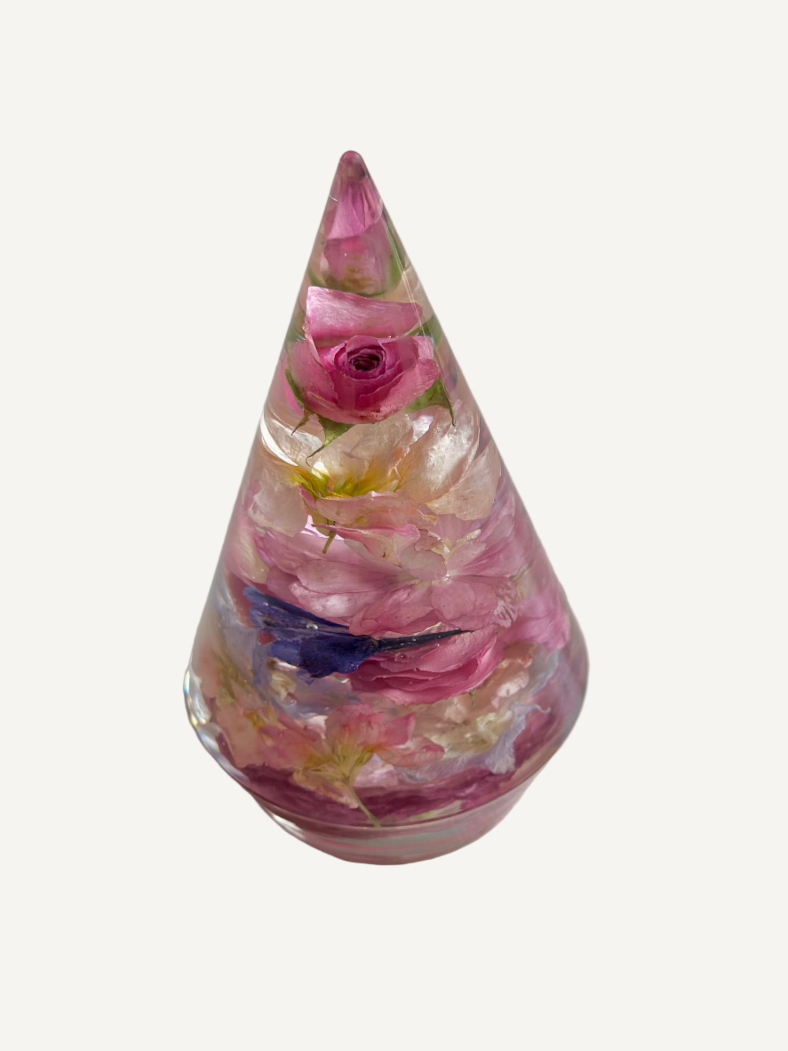 A stunning 6 inch tall bracelet holder crafted in crystal clear resin to showcase your cherished bridal blooms. Each flower from your preserved bouquet is artfully arranged in a multidimensional design appearing to float gracefully within the piece